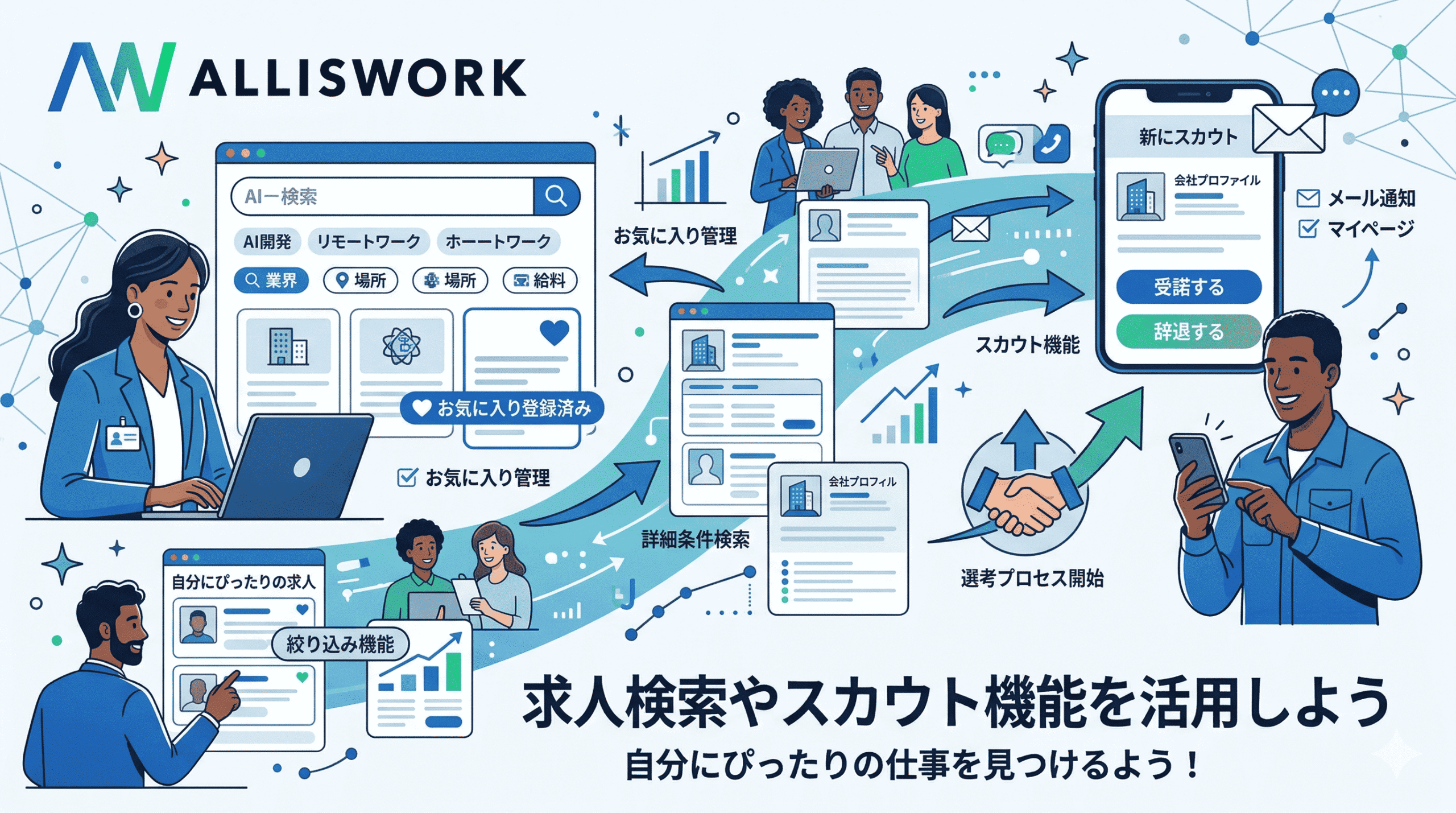 ALLISWORKの求人検索ページでは、主に2つの方法を組み合わせて仕事を探すことができます。