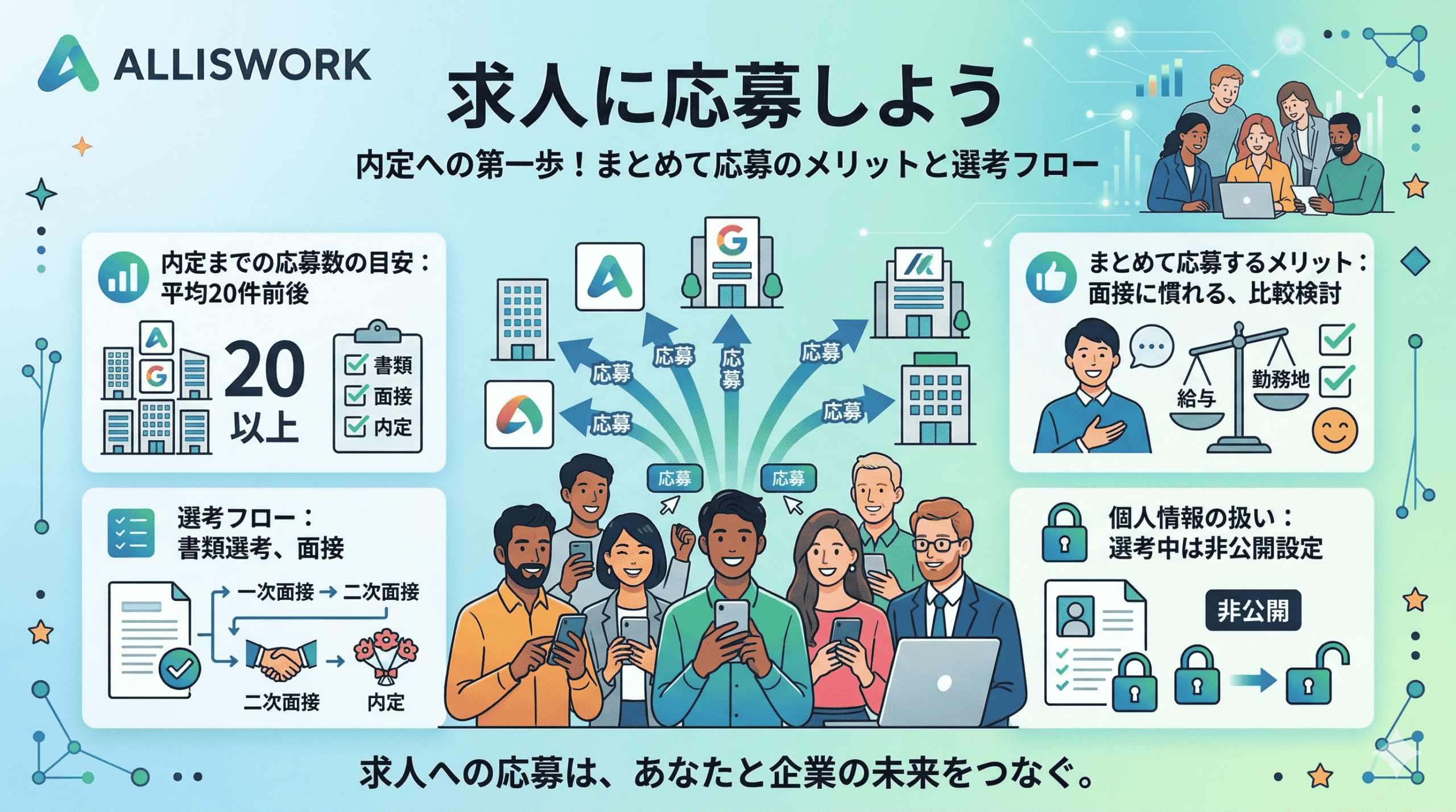 正社員としての採用を目指す場合、内定が出るまでの平均的な応募数は20件前後と言われています。最初から1社に絞りすぎず、興味を持てる企業には積極的にアプローチしましょう。