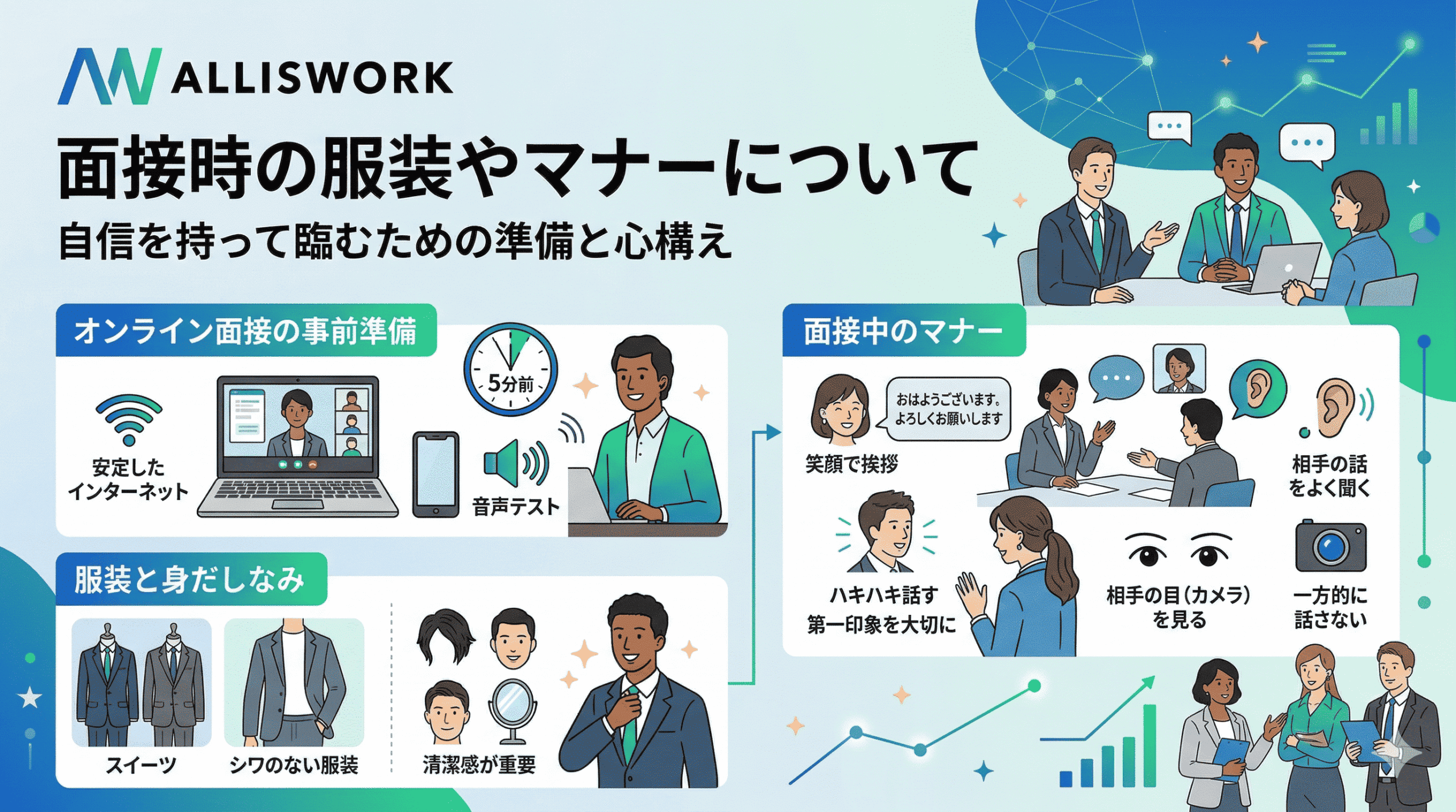 - 清潔感のない服装や髪型は避けましょう。スーツや、指定があればオフィスカジュアルなど、シワのない整った服を着用します。